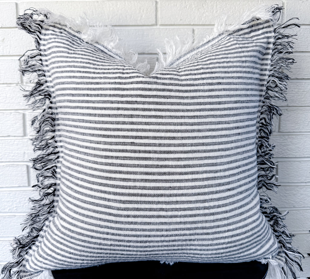 Fringed European Flax Linen Cushion Cover - Charcoal Stripe